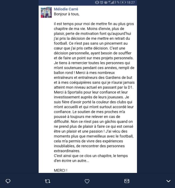 Stade Brestois goalkeeper (D2), 25-year-old Melodie Carré, announced on Thursday on Twitter that she was putting her football career on hold. She explained her decision with a loss of desire, pleasure, motivation and the need to focus on personal projects.